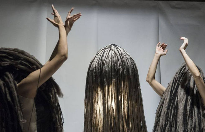 It is made up of bodies connected or interwoven by their hair or heads. In an indecipherable mystery, their faces are completely covered by a woollen mask (animal hair) that extends into space, forming a collective web. This human mass, linked together, breathes in unison, making movements that construct different human landscapes in a parallel or frozen time, as an analogy to the relativity of time and space. They could be archaic, brought from another time, from the time when homo sapiens populated the earth, they could be the brutal human that underlies our current state. This piece is a totemic ritual of human thought. A question installed in that moment of the beginning of civilisation, that which remains despite our evolution.